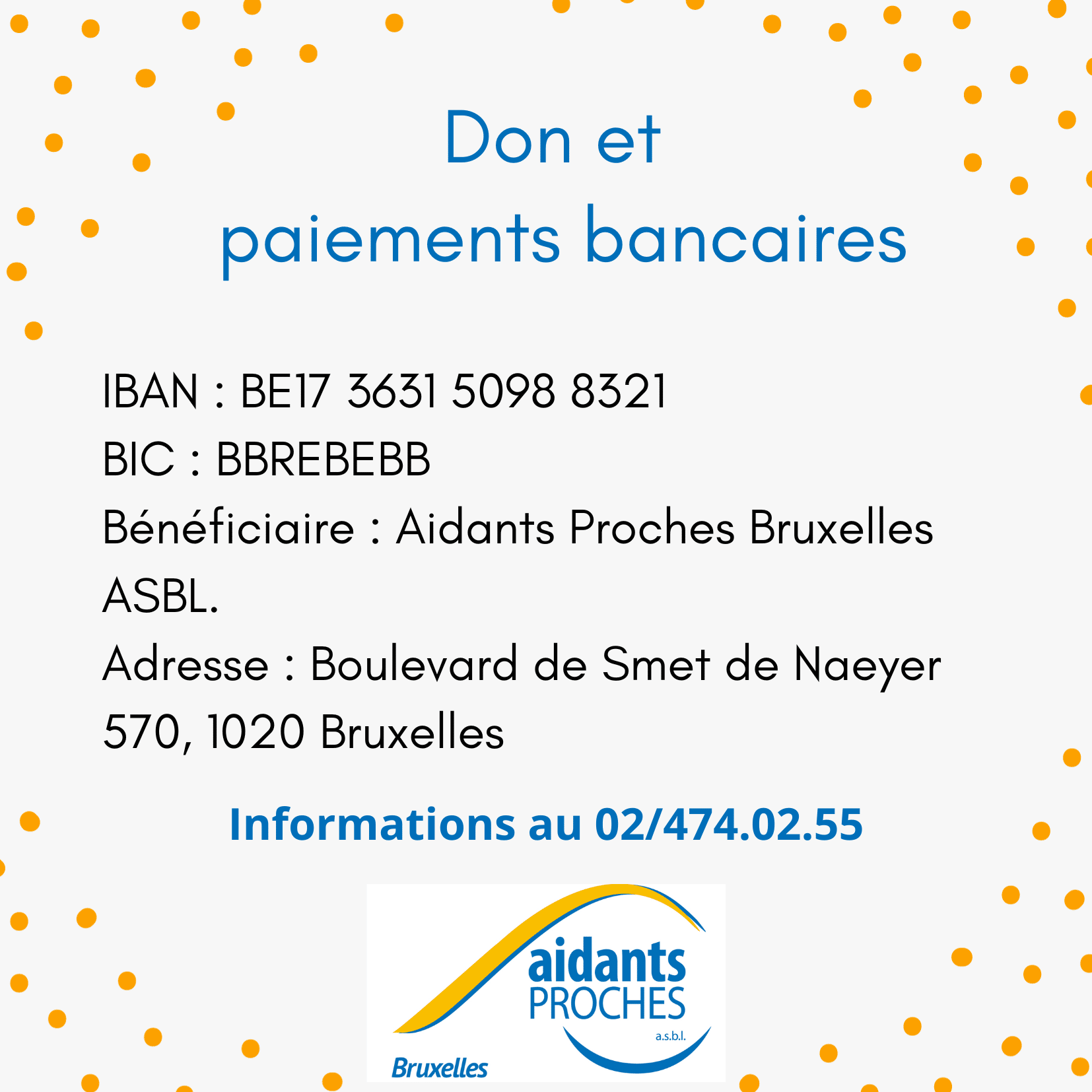 Si vous désirez soutenir l’ASBL, vous pouvez le faire au moyen d’un don financier. Ces dons nous permettront de développer l’ASBL et ses projets en faveur des aidants proches. Vous pouvez faire un don unique (ponctuel) ou par ordre permanent (don régulier). Merci pour votre aide !
